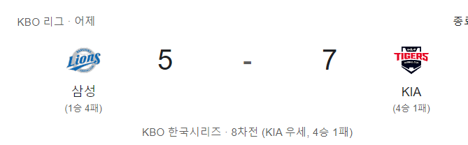 기아 타이거즈는 10월 28일 광주 챔피언스 파크에서 열린 2024 한국시리즈 5차전에서 삼성 라이온즈를 7대5로 누르고 승리하였습니다.