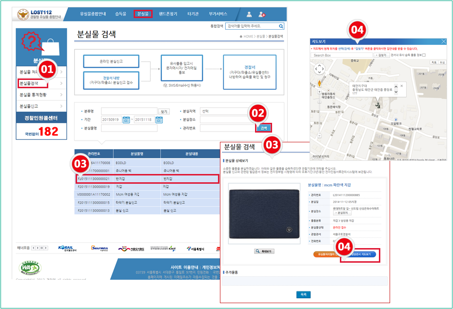- 홈페이지에서 '분실물 검색' 메뉴를 클릭합니다.